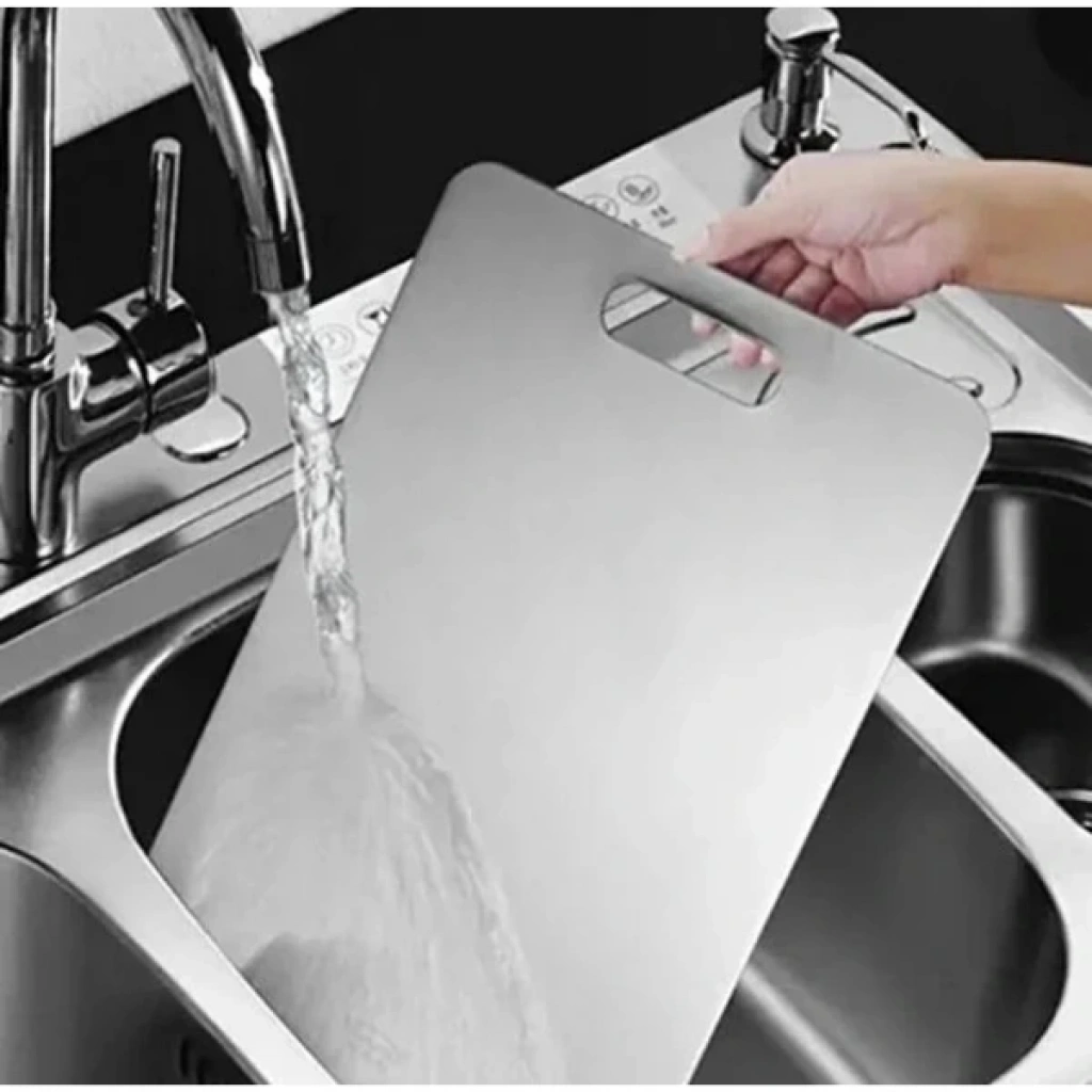 2'Lİ PASLANMAZ ÇELİK KESİM PANOSU SETİÜrün Özellikleri2’li paslanmaz çelik kesim panosu seti, mutfakta hijyenik ve uzun ömürlü kullanım için özel olarak tasarlanmıştır. 18/10 304 kalite paslanmaz çelikten üretilmiş olan bu panolar, gıda için en uygun ve sağlıklı çelikten üretilmiştir, çift taraf skoçlu yüzeyleri sayesinde her iki yüzeyi de kesim için kullanıma uygundur. 0.90 mm kalınlığıyla sağlam ve dayanıklıdır, kolay kolay deformasyon göstermez. Antibakteriyel yapısı sayesinde gıda güvenliğini destekler ve yüzeyi leke tutmaz. Büyük boy 33x23 cm, küçük boy ise 28x20 cm ölçülerindedir. Kırılmaz yapısı ve sağlıklı kullanım özelliği ile mutfakta güvenli bir çözüm sunar. Elde ya da bulaşık makinesinde kolayca yıkanabilir.Paket İçeriği1 adet büyük boy paslanmaz çelik kesim panosu (33x23 cm)1 adet küçük boy paslanmaz çelik kesim panosu (28x20 cm)